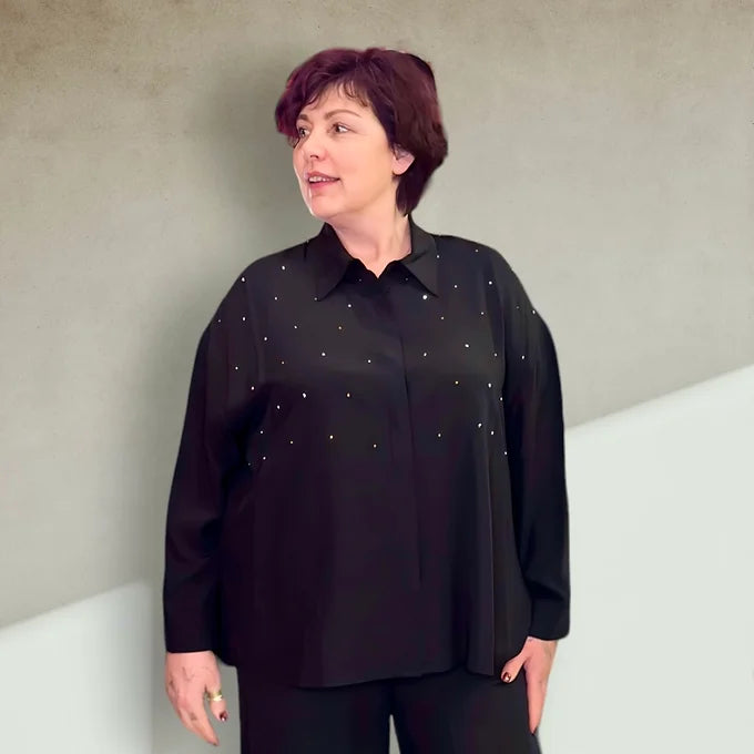 Entièrement boutonnée, elle est facile à porter et à ajuster selon vos préférences. Son col chemise classique ajoute une touche de sophistication à votre tenue, tandis que les petits clous dorés et argentés apportent une touche de glamour.