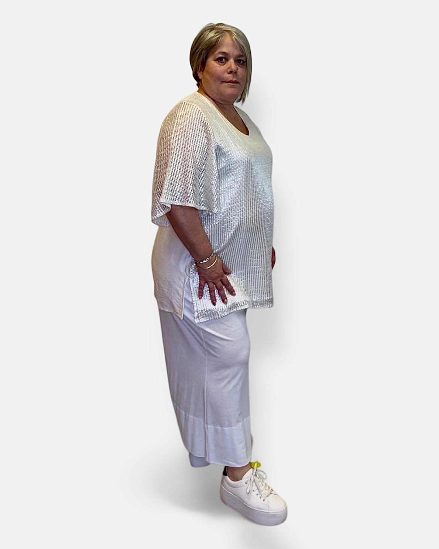 La tunique Miroir est une pièce éblouissante qui ajoutera une touche de glamour à votre garde-robe. Confectionnée à 83% en lin et 17% en nylon, elle combine légèreté et confort. Avec sa coupe ample et ses manches 3/4, elle est agréable à porter tout en étant stylée. Disponible en argenté pour un éclat subtil et en doré pour briller encore plus, cette tunique est parfaite pour des occasions spéciales ou une sortie en soirée.
